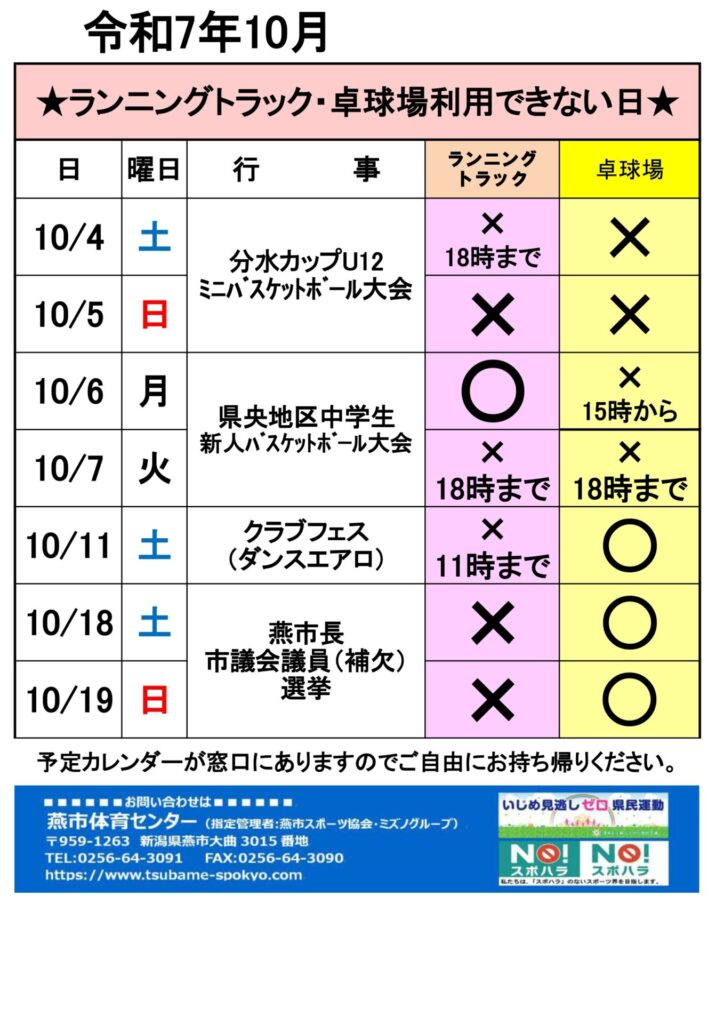 大会やイベント等でランニングトラック・卓球ホールがご利用出来ない日がございますので、ご来館の際はこちらのカレンダーをご確認ください。
