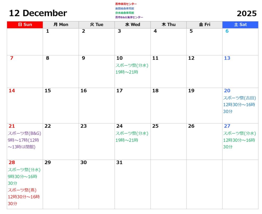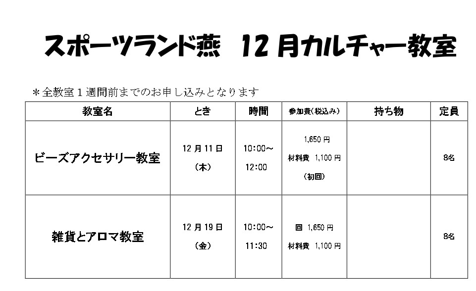 スポーツランド燕カルチャー教室12月の日程はこちらからご確認ください。