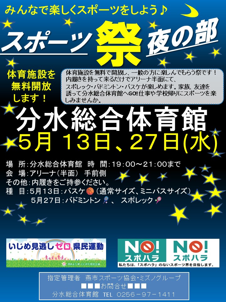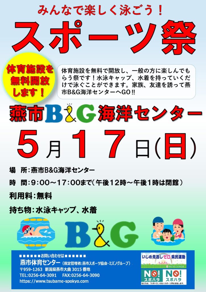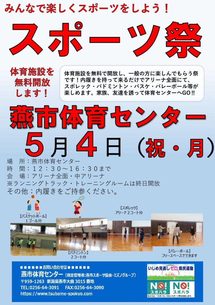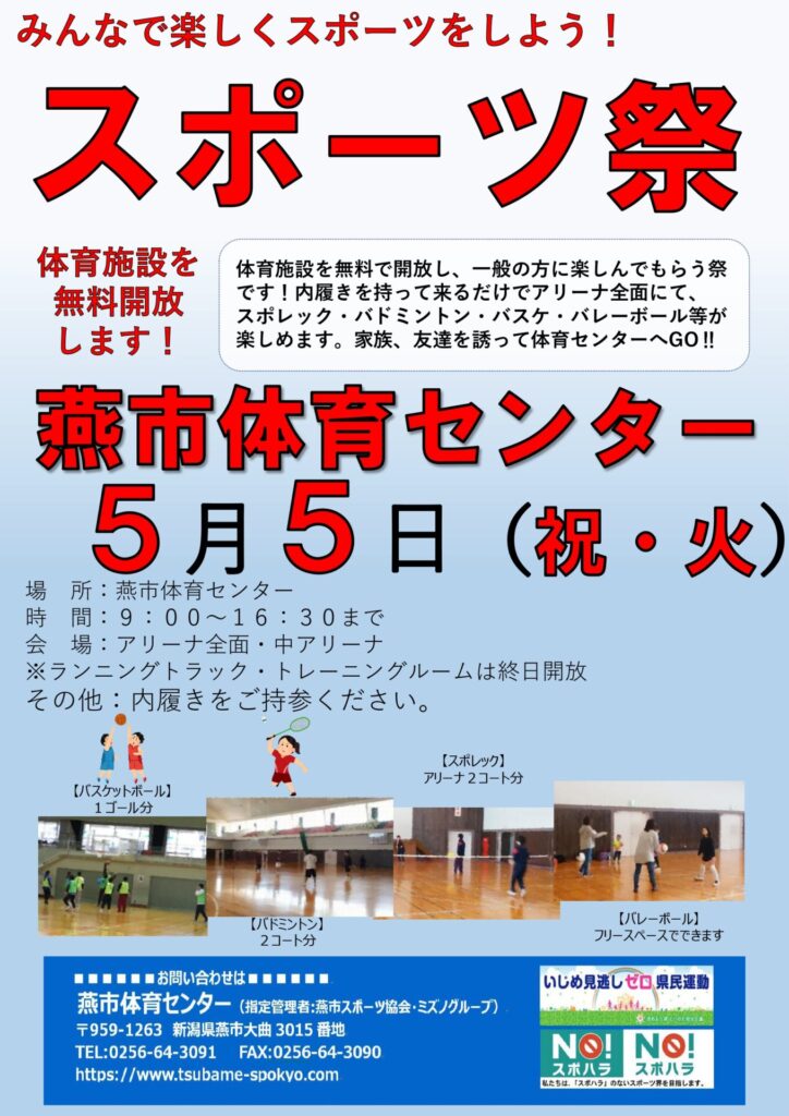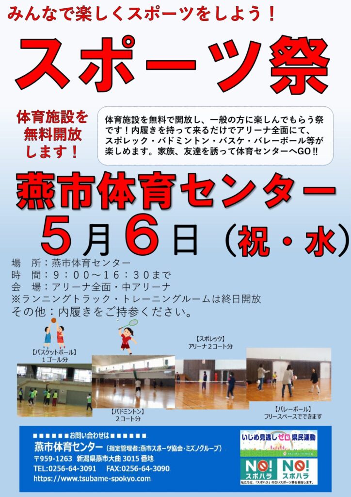 令和8年5月の燕市スポーツ施設のスポーツ祭(無料開放)のスケジュールはこちらからご確認ください。